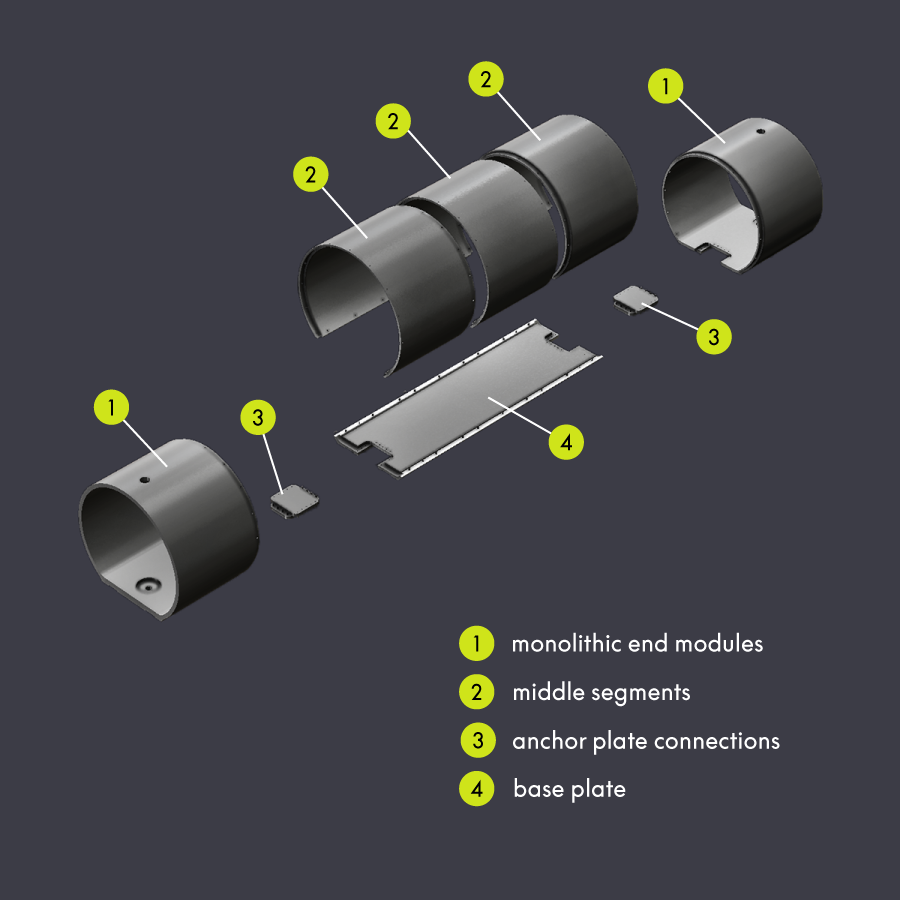 The regular insertion and removal of heavy workpieces using a roller system (e.g. carbide blanks) creates large forces, particularly on the first base element. These can lead to cracks or fractures in modular designs, with considerable consequences for production, maintenance and cost-effectiveness.